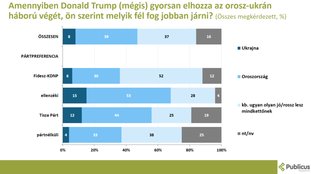 Amennyiben Donald Trump (mégis) gyorsan elhozza az orosz-ukrán háború végét, akkor tízből négy (39 százalék) válaszadó szerint Oroszország fog jobban járni. Így gondolja az ellenzéki szavazók többsége (53 százalék), a Tisza Párt szavazóinak 44 százaléka, a pártnélküliek 33 százaléka, illetve a Fidesz szavazók 30 százaléka.