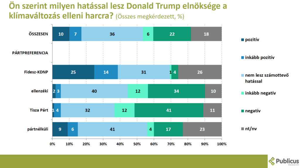 Tízből közel négy (36 százalék) válaszadó szerint nem lesz számottevő hatással Donald Trump elnöksége a klímaváltozás elleni harcra. Így nyilatkozott a pártnélküliek és az ellenzéki szavazók közül is tízből négy (40-41 százalék), a Tisza Párt szavazóinak a 32 százaléka, illetve a Fidesz szavazók 31 százaléka.