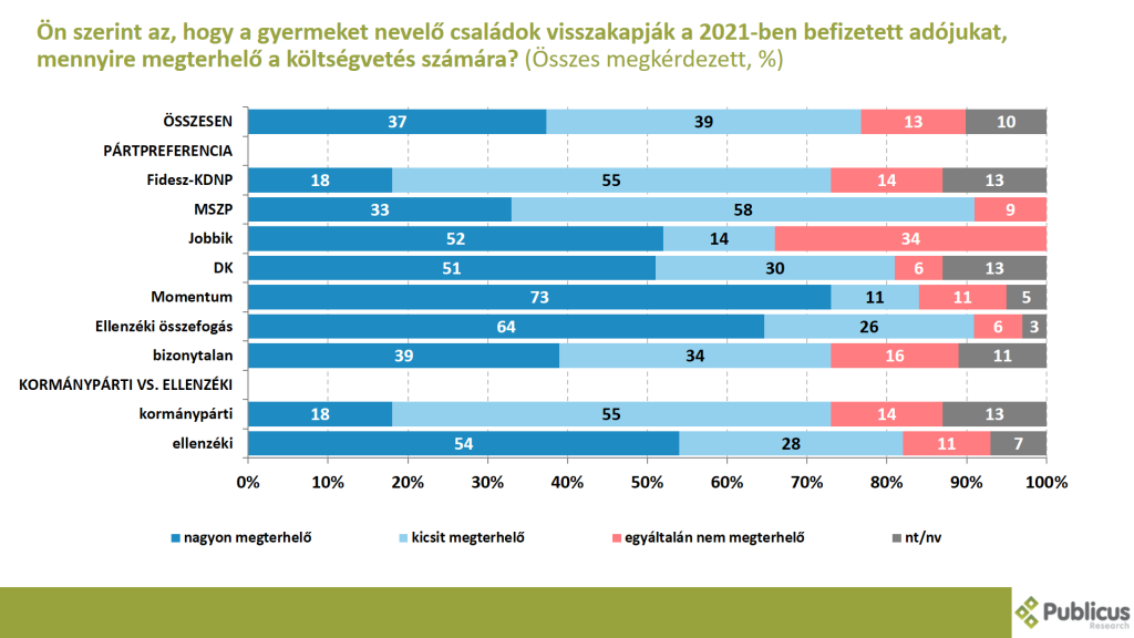 Míg az ellenzéki szavazók többsége (54 százalék) szerint nagyon, addig a kormánypárti szavazók többsége (55 százalék) szerint csak kicsit lenne megterhelő a magyar költségvetés számára, ha a gyermeket nevelő családok visszakapnák a 2021-ben befizetett adójukat. A bizonytalan szavazók közül picit többen (39-34 százalék) látják úgy, hogy nagyon megterhelné a magyar államkasszát egy ilyen kormányzati intézkedés.