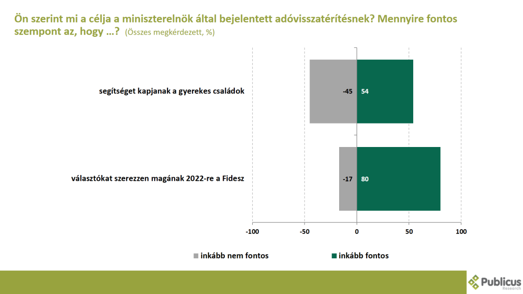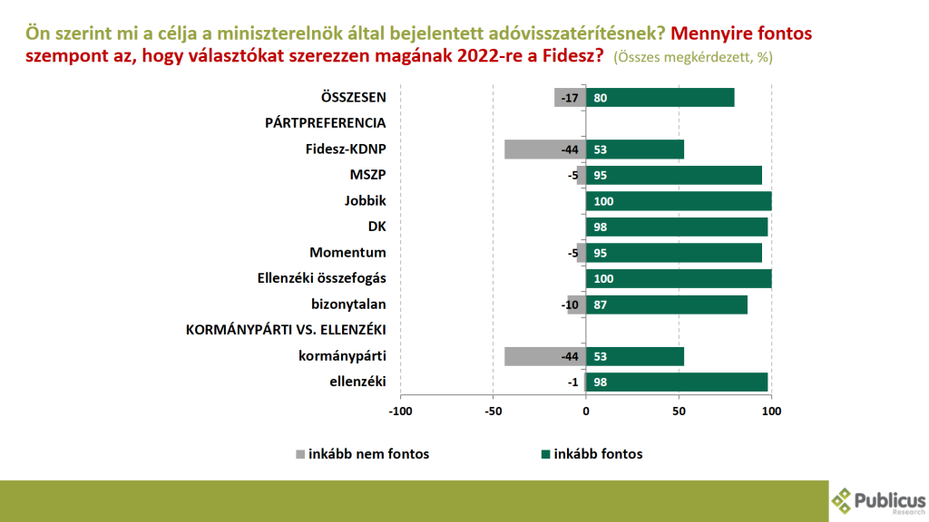 Az ellenzéki szavazók és a bizonytalan szavazók túlnyomó többsége, (98 és 87 százalék), továbbá még a kormánypárti szavazók enyhe többsége (53 százalék) szerint is inkább fontos szempont volt a miniszterelnök által bejelentett adóvisszatérítésnél, hogy így 2022-re választókat szerezzen magának a Fidesz.