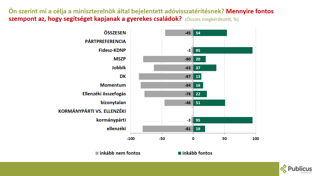 Míg szinte az összes (95 százalék) kormánypárti szavazó szerint inkább fontos szempontja volt a miniszterelnök által bejelentett adóvisszatérítésnek a gyerekes családok megsegítése, addig az ellenzéki szavazók közül tízből nyolcan (81 százalék) ennek az ellenkezőjét látják. A bizonytalan szavazók megosztottak a kérdésben (51-46 százalék).