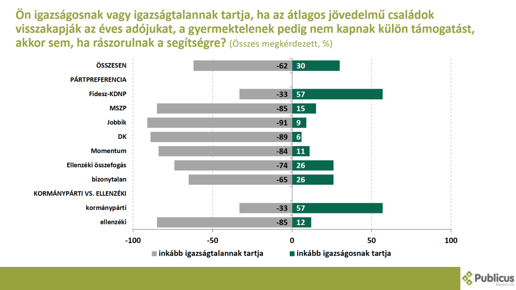Tízből hat (62 százalék) megkérdezett inkább igazságtalannak tartja, ha az átlagos jövedelmű családok visszakapják az éves adójukat, a gyermektelenek pedig nem kapnak külön támogatást, akkor sem, ha rászorulnak segítségre. Így látja tízből közel kilenc (85 százalék) ellenzéki szavazó, továbbá a bizonytalan szavazók kétharmada (65 százalék), illetve a Fidesz szavazók harmada (33 százalék) is.