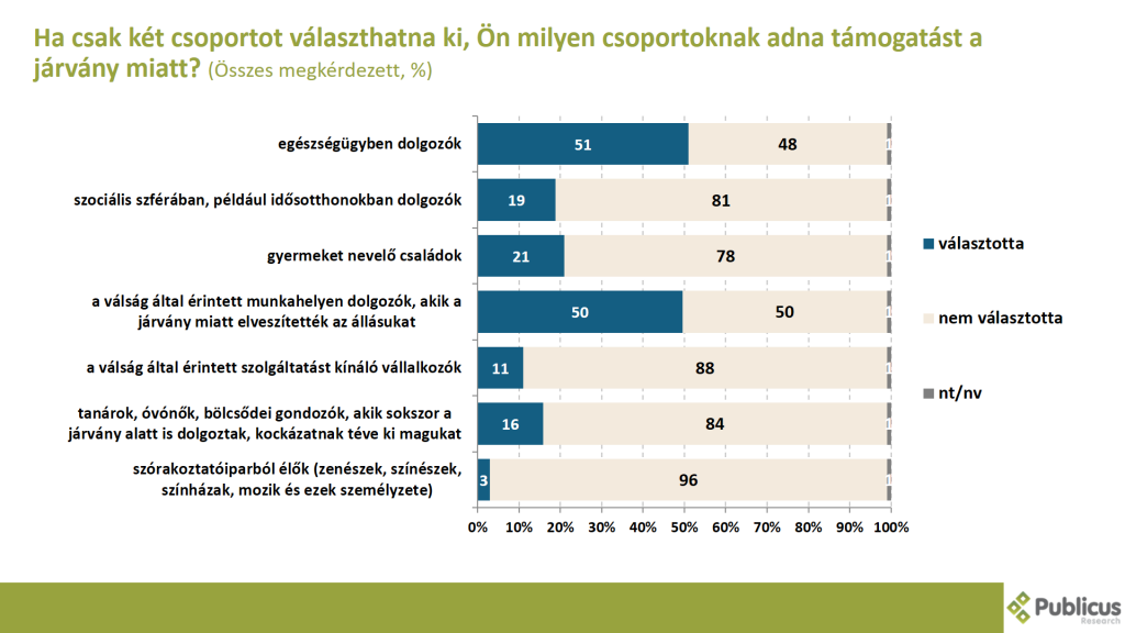 A megkérdezettek (amennyiben csak két csoportot választhatnak ki) leginkább az egészségügyben dolgozóknak (51 százalék ), továbbá azoknak a válság által érintett munkahelyen dolgozóknak adnának támogatást, akik a járvány miatt vesztették el az állásukat (50 százalék).