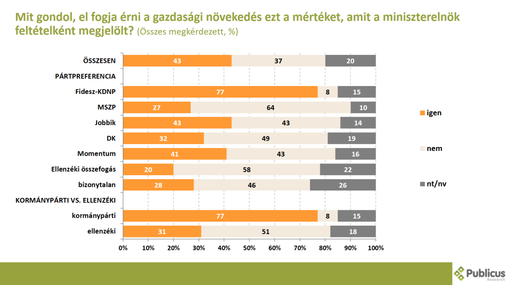 Tízből nyolc (77 százalék) kormánypárti szavazó úgy látja, hogy a gazdasági növekedés el fogja érni a GDP 5,5 százalékát. Tízből három ellenzéki (31 százalék), illetve szintén tízből három (28 százalék) bizonytalan szavazó szerint azonban a miniszterelnök által kitűzött célt a magyar gazdaság nem fogja elérni.