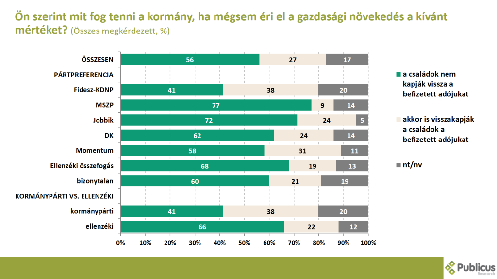 Tízből hat (56 százalék) megkérdezett szerint ha mégsem éri el a gazdasági növekedés a kívánt mértéket, akkor a családok nem kapják vissza a befizetett adójukat. A válaszadók negyede (27 százalék) szerint azonban ebben az esetben is vissza fogják kapni pénzt. Így látja tízből négy (38 százalék) kormánypárti, tízből kettő ellenzéki (22 százalék), illetve szintén tízből kettő (21 százalék) bizonytalan szavazó is.