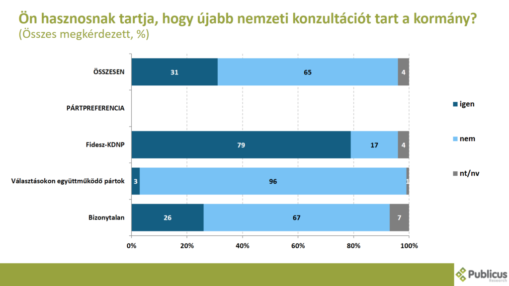 A megkérdezettek kétharmada (65 százalék) nem tartja hasznosnak, hogy újabb nemzeti konzultációt tart a kormány. Így nyilatkozott a választásokon együttműködő ellenzéki pártok szavazói közül szinte az összes (96 százalék), a bizonytalan szavazók kétharmada (67 százalék), illetve a Fidesz szavazók közel ötöde (17 százalék).