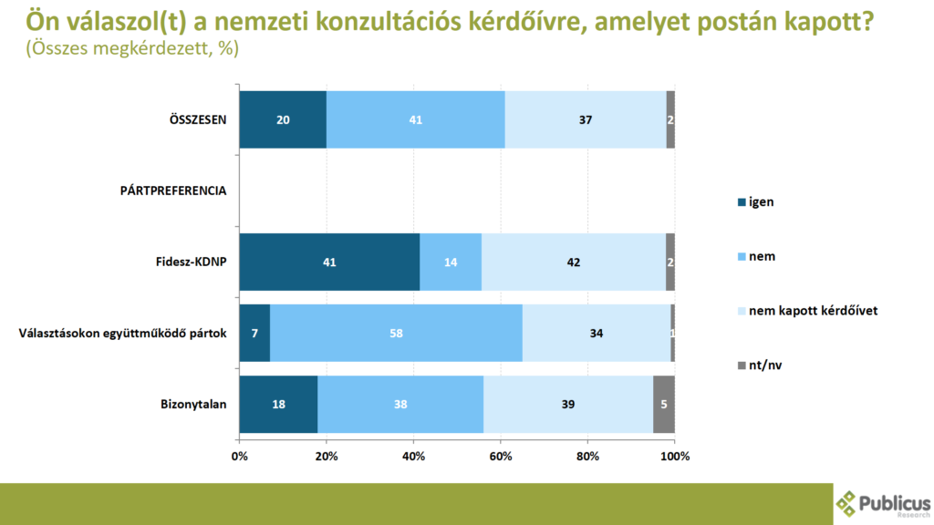 Tízből kettő (20 százalék) megkérdezett válaszol(t) a nemzeti konzultációs kérdőívre, amelyet postán kapott. Ezt mondta tízből négy (41 százalék) Fidesz szavazó, tízből közel kettő (18 százalék) bizonytalan szavazó, illetve a választásokon együttműködő ellenzéki pártok szavazói közül 7 százaléknyi.