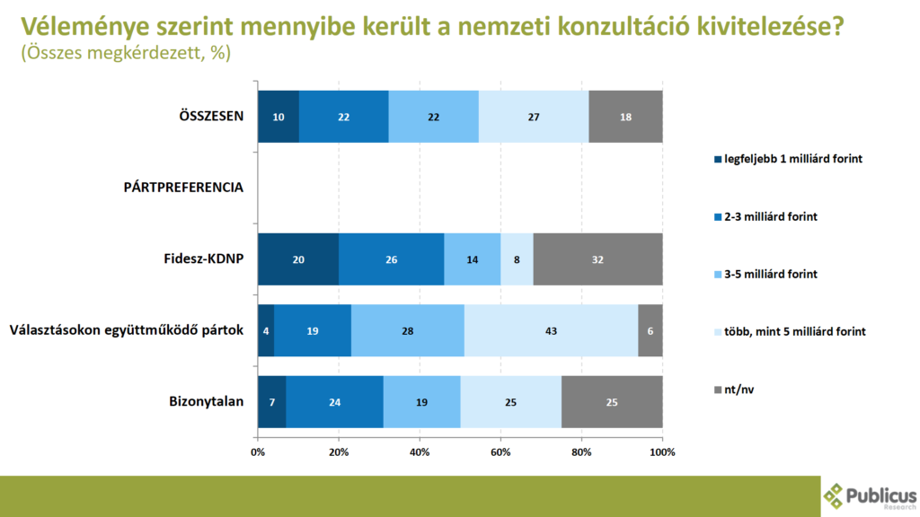A megkérdezettek negyede (27 százalék) szerint több, mint öt milliárd forintba került a nemzeti konzultáció kivitelezése. Ezt mondta a választásokon együttműködő ellenzéki pártok szavazói közül tízből négy (43 százalék), a bizonytalan szavazók negyede (25 százalék), illetve a Fidesz szavazók 8 százaléka.