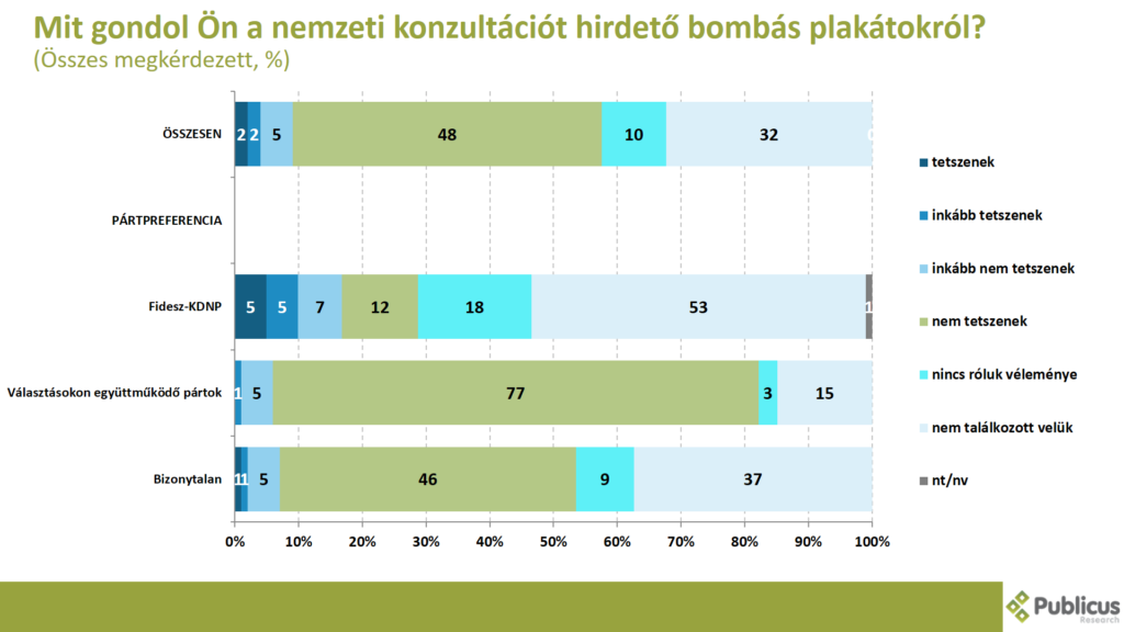 A válaszadók többségének (53 százalék) vagy nem tetszenek (48 százalék), vagy pedig inkább nem tetszenek (5 százalék) a nemzeti konzultációt hirdető bombás plakátok. Ezt mondta a választásokon együttműködő ellenzéki pártok szavazói közül tízből nyolc (77+5 százalék), minden második (46+5 százalék) bizonytalan szavazó, illetve minden ötödik (12+7 százalék) Fidesz szavazó.