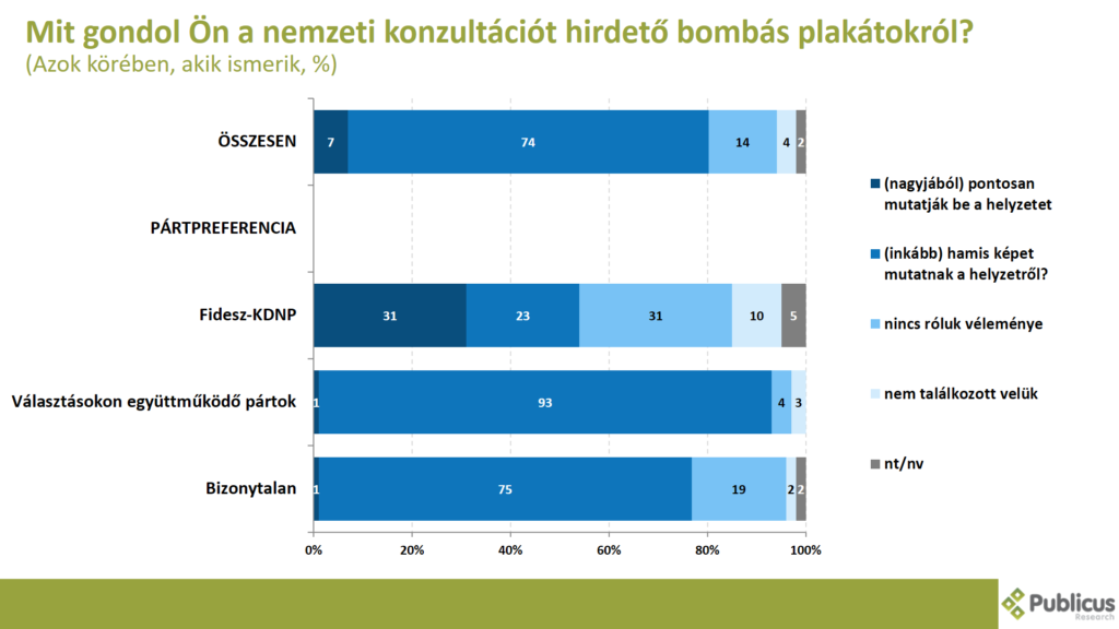 Azok körében, akik ismerik a nemzeti konzultációt hirdető bombás plakátokat, a válaszadók háromnegyede (74 százalék) mondta azt, hogy (inkább) hamis képet mutatnak a helyzetről. Így látja a választásokon együttműködő ellenzéki pártok szavazóinak túlnyomó többsége (93 százalék), a bizonytalan szavazók háromnegyede (75 százalék), illetve a Fidesz szavazók negyede (23 százalék).