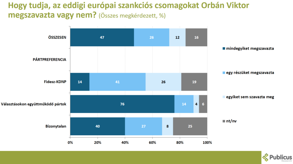 Közel minden második (47 százalék) megkérdezett tudja úgy (helyesen), hogy az eddigi európai szankciós csomagok közül Orbán Viktor mindegyiket megszavazta. Így nyilatkozott a választásokon együttműködő ellenzéki pártok szavazóinak a háromnegyede (76 százalék), tízből négy (40 százalék) bizonytalan szavazó, illetve a Fidesz szavazóinak 14 százaléka.