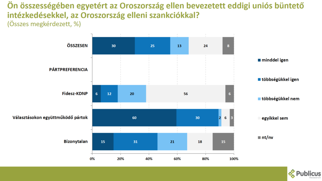 A válaszadók negyede (25 százalék) egyetért az Oroszország elleni szankciók többségével. Ezt mondta a választásokon együttműködő ellenzéki pártok szavazói közül tízből három (30 százalék), majdnem ugyanennyi bizonytalan szavazó (31 százalék), illetve minden nyolcadik (12 százalék) Fidesz szavazó.