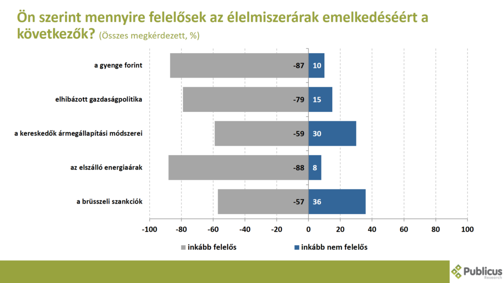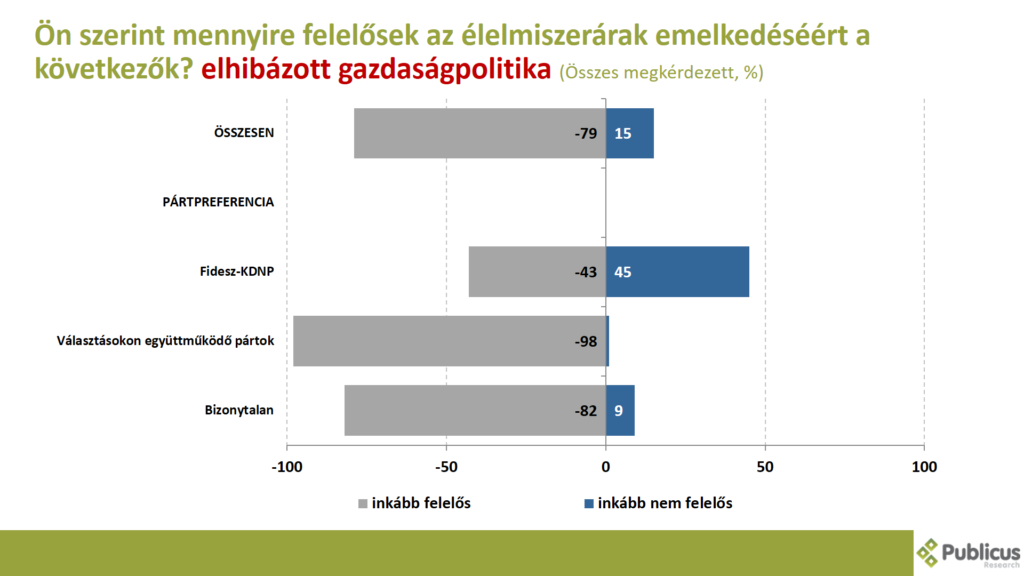 A választásokon együttműködő ellenzéki pártok szavazói közül szinte a mindegyik (98 százalék), tízből nyolc (82 százalék) bizonytalan szavazó, illetve tízből négy (43 százalék) Fidesz szavazó mondta azt, hogy az elhibázott gazdaságpolitika inkább felelős az élelmiszerárak emelkedéséért.