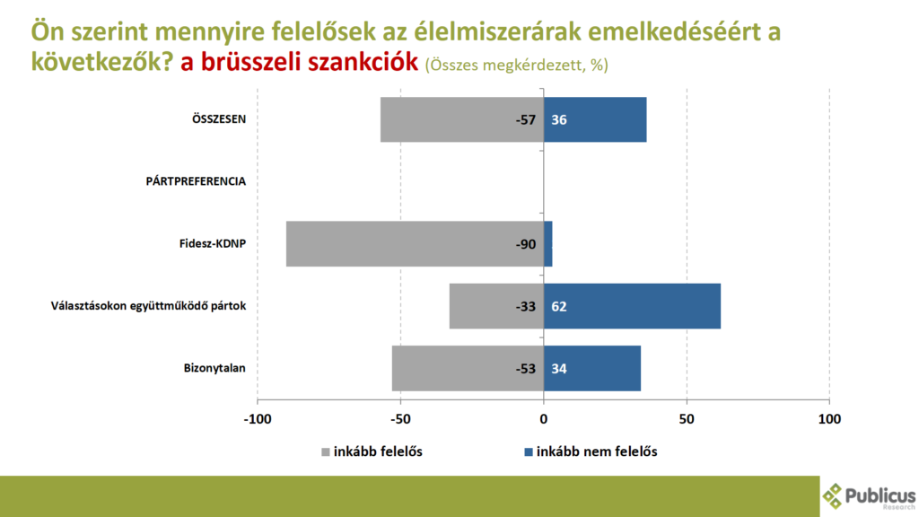 Tízből kilenc (90 százalék) Fidesz szavazó, a bizonytalan szavazók enyhe többsége (53 százalék), illetve a választásokon együttműködő ellenzéki pártok szavazóinak a harmada (33 százalék) szerint a brüsszeli szankciók inkább felelősek az élelmiszerárak emelkedéséért.