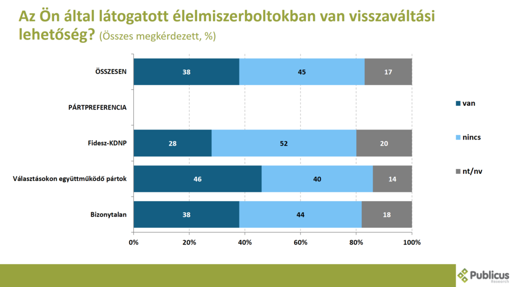 Tízből négy (38 százalék) megkérdezett mondta azt, hogy az általuk látogatott élelmiszerboltokban van visszaváltási lehetőség. Így nyilatkozott a választásokon együttműködő ellenzéki pártok szavazóinak közel fele (46 százalék), tízből négy (38 százalék) bizonytalan szavazó, illetve tízből három (28 százalék) Fidesz szavazó.