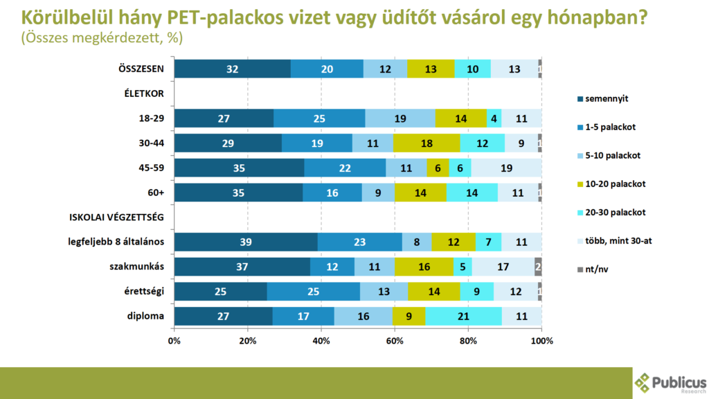 Tízből közel négy (36 százalék) megkérdezett tíznél több PET-palackos vizet vagy üdítőt vásárol egy hónapban. Leginkább 30-44 év közöttiek és a 60 évnél idősebbek (39 százalék) illetve a diplomások (41 százalék), és a szakmunkások (38 százalék) nyilatkoztak így.