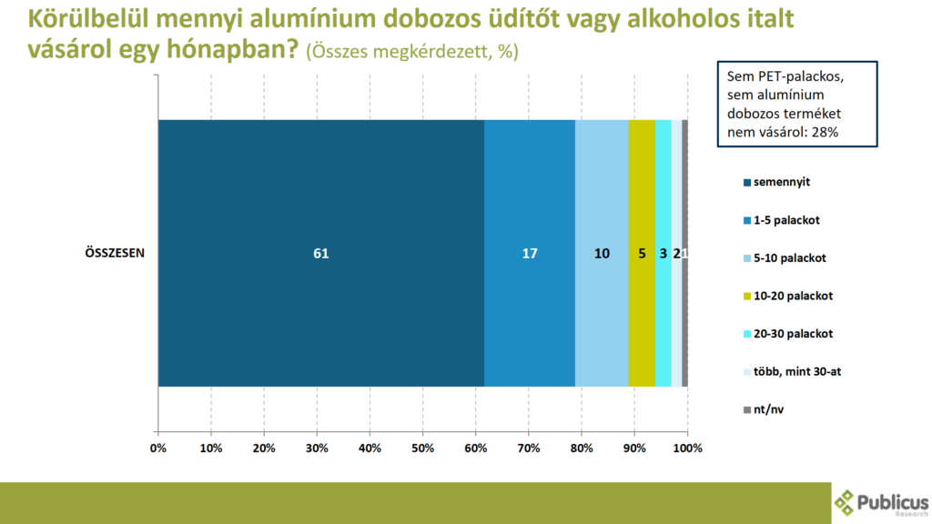 Tízből hat (61 százalék) válaszadó egyetlen egy alumínium dobozos üditőt vagy alkoholos italt sem vásárol egy hónapban. Tízből közel három (28 százalék) megkérdezett sem PET-palackos, sem alumínium dobozos terméket nem vásárol.