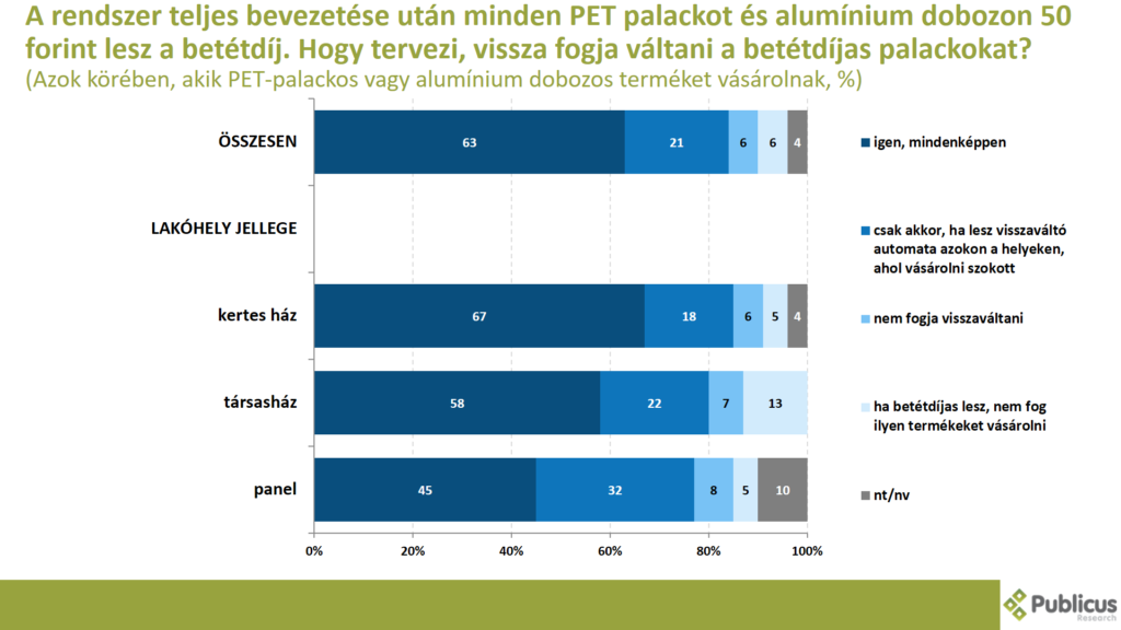 A rendszer teljes bevezetése után minden PET palackot és alumínium dobozon 50 forint lesz a betétdíj. Azok körében, akik PET-palackos vagy alumínium dobozos terméket vásárolnak, a közel kétharmad (63 százalék) úgy tervezi, hogy mindenképpen vissza fogja váltani a betétdíjas palackokat. Így nyilatkozott a kertesházban élők kétharmada (67 százalék), a társasházban élők közül tízből hat (58 százalék), illetve a panel házban élők közül majdnem minden második (45 százalék).