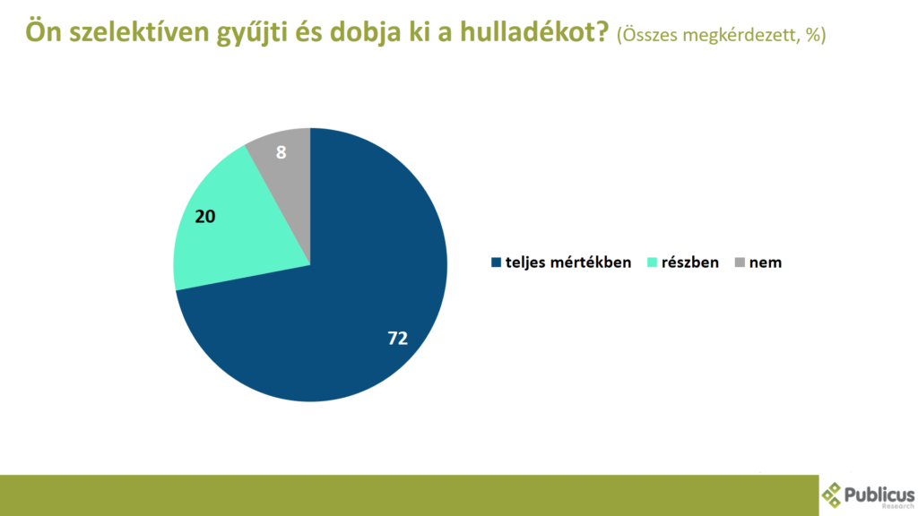 Tízből hét (72 százalék) válaszadó teljes mértékben, tízből kettő (20 százalék) részben, minden tizedik (8 százalék) megkérdezett pedig nem gyűjti szelektíven a hulladékot.