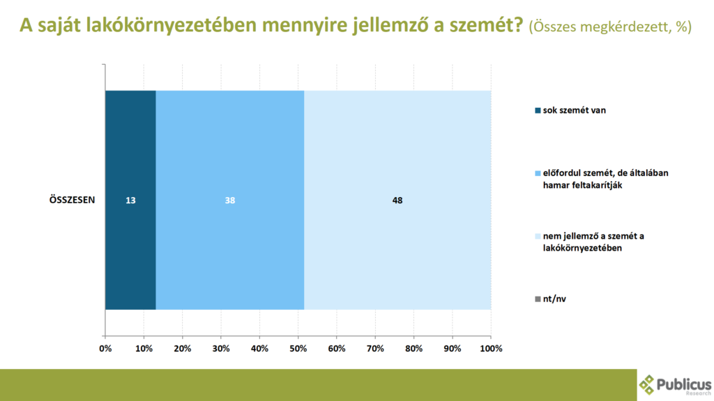 Közel minden nyolcadik (13 százalék) válaszadó szerint sok szemét van a lakókörnyezetében. Tízből közel négy (38 százalék) megkérdezett szerint előfordul szemét, de általában hamar feltakarítják. Közel minden második (48 százalék) válaszadó mondta azt, hogy nem jellemző szemét a lakókörnyezetében.