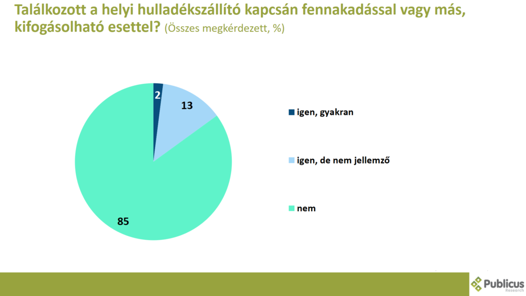 A megkérdezettek 2 százaléka találkozott gyakran, 13 százaléka pedig ritkábban a helyi hulladékszállító kapcsán fennakadással, vagy más, kifogásolható esettel. A válaszadók 85 százaléka nem találkozott ilyennel.