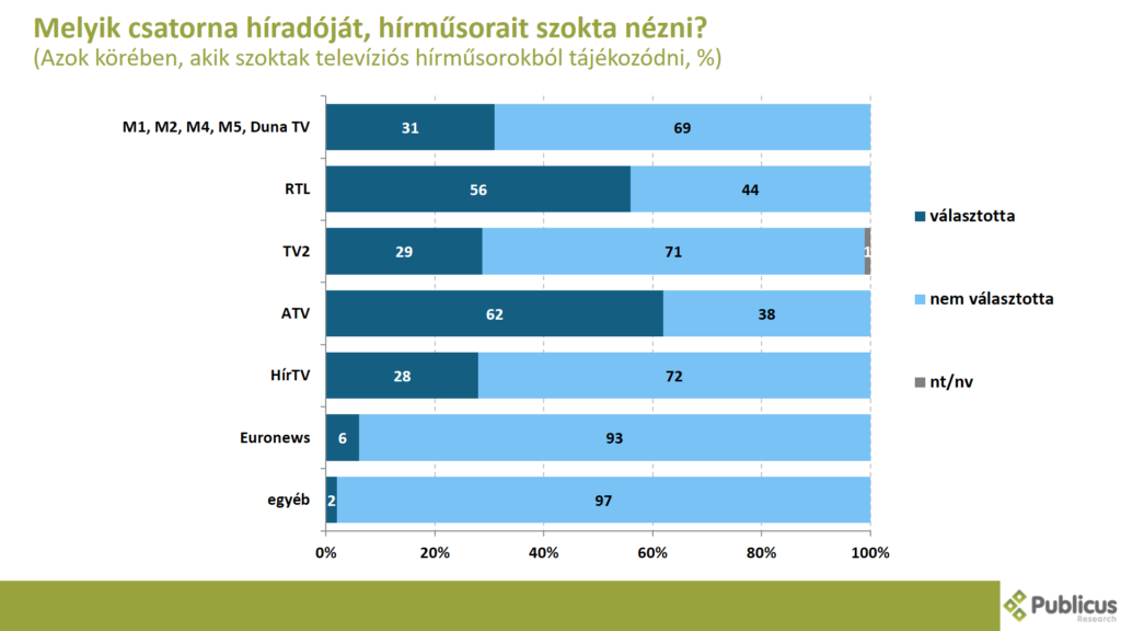 Tízből közel négy válaszadó mondta azt, hogy leggyakrabban az ATV híradóját, hírműsorait szokta nézni. Tízből közel három megkérdezett leggyakrabban az RTL híradóját követi figyelemmel. A válaszadók 13 százaléka a köztévét, 11 százalék a TV2-öt, további 6 százalék pedig a HírTV-t nézi leginkább figyelemmel ha tájékozódni akar.