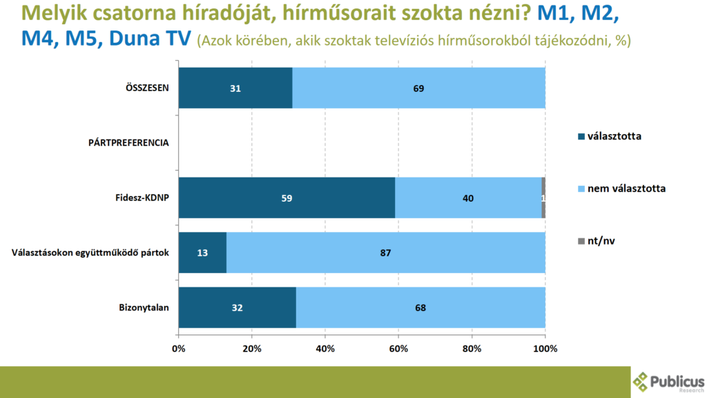 Tízből hat (59 százalék) Fidesz szavazó, a bizonytalan szavazók harmada (32 százalék) illetve a választásokon együttműködő ellenzéki pártok szavazóinak a 13 százaléka mondta azt, hogy a köztévé (M1, M2, M4, M5, Duna TV) híradóját, hírműsorait szokta nézni.