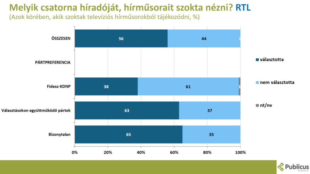 A bizonytalan szavazók kétharmada (65 százalék), a választásokon együttműködő ellenzéki pártok szavazóinak közel kétharmada (63 százalék), illetve tízből négy (38 százalék) Fidesz szavazó az RTL híradóját, hírműsorait szokta nézni.