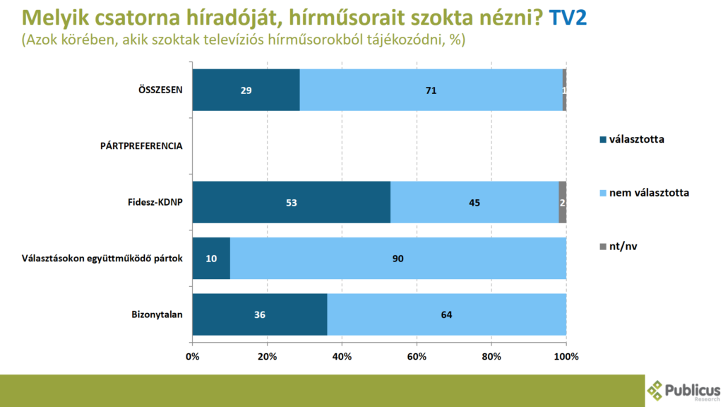 A Fidesz szavazók enyhe többsége (53 százalék) tízből közel négy (36 százalék) bizonytalan szavazó, illetve a választásokon együttműködő ellenzéki pártok szavazói közül minden tizedik (10 százalék) a TV2 híradóját, hírműsorait szokta nézni.