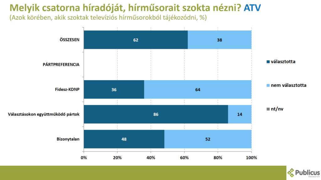 Tízből közel négy (36 százalék) válaszadó mondta azt, hogy leggyakrabban az ATV híradóját, hírműsorait szokta nézni. Így nyilatkozott a választásokon együttműködő ellenzéki pártok szavazói közül tízből hat (61 százalék), a bizonytalan szavazók negyede (23 százalék), illetve a Fidesz szavazók 5 százaléka.