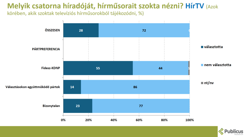 A Fidesz szavazók többsége (55 százalék) a bizonytalan szavazók negyede (23 százalék), illetve a választásokon együttműködő ellenzéki pártok szavazóinak a 14 százaléka a HírTV híradóját, hírműsorait szokta nézni.