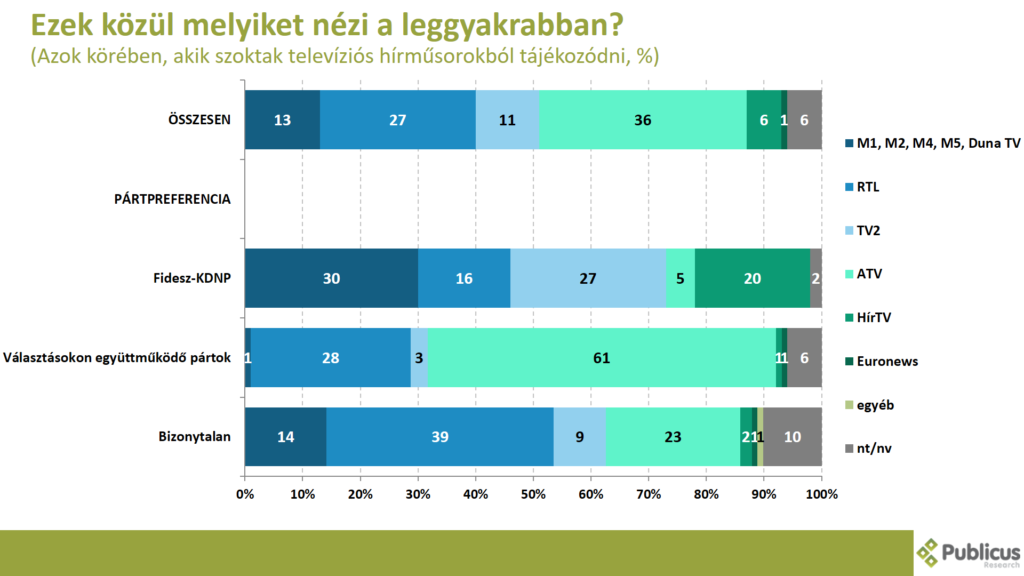 A Fidesz szavazók közel harmada a köztévé hírműsorait, negyede a TV2, ötöde pedig a HírTV híradóját nézi a leggyakrabban. A választásokon együttműködő ellenzéki pártok szavazói közül tízből hatan az ATV, tízből hárman pedig az RTL hírműsorait követi leginkább figyelemmel. A bizonytalan szavazók közül tízből négy az RTL, közel negyedük az ATV, 14 százalékuk a köztévé, 9 százalékuk pedig a TV2 híradóit nézi a leggyakrabban.