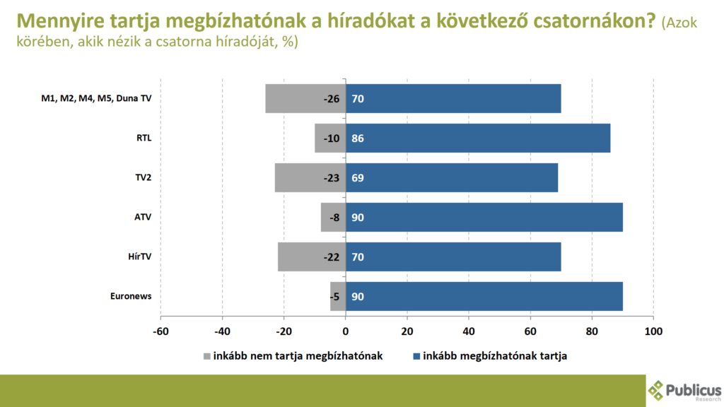 A válaszadók legmegbízhatóbbnak az ATV (90 százalék) az Euronews (90 százalék) és az RTL (86 százalék) híradóit nevezték meg, a legkevésbé megbízhatóbbnak pedig a közmédia (70 százalék), a HírTV (70 százalék) és a TV2 (69 százalék) hírműsorait.