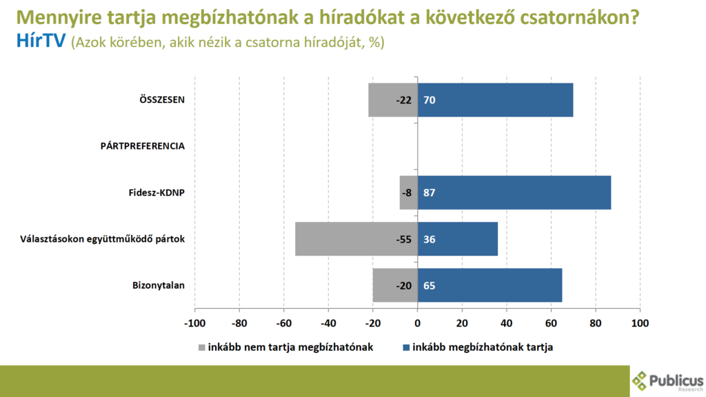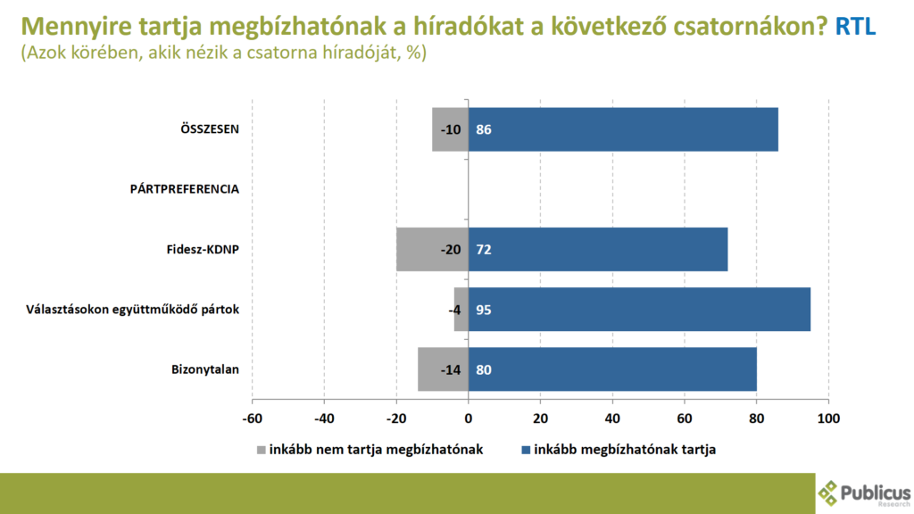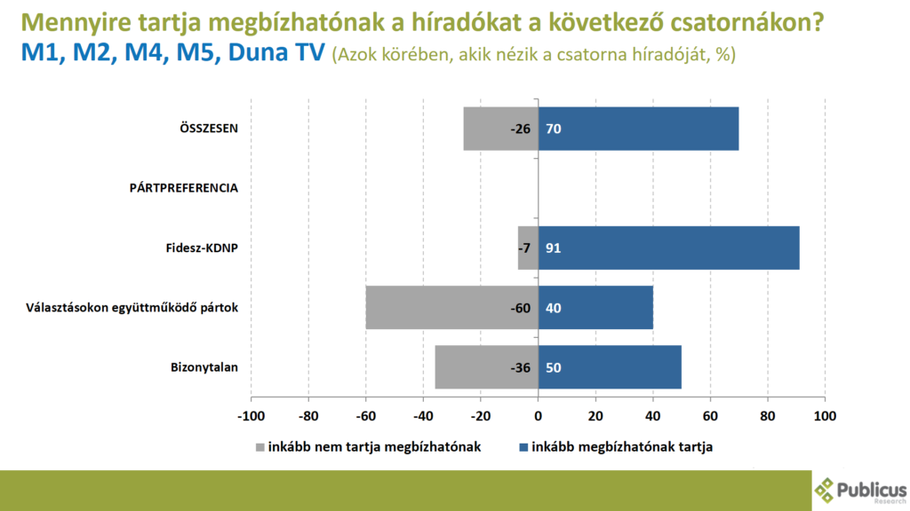 Tízből kilenc (90 százalék) Fidesz szavazó, tízből öt (50 százalék) bizonytalan szavazó, illetve a választásokon együttműködő ellenzéki pártok szavazói közül tízből négy (40 százalék) mondta azt, hogy inkább megbízhatónak tartja a közmédia híradóit.