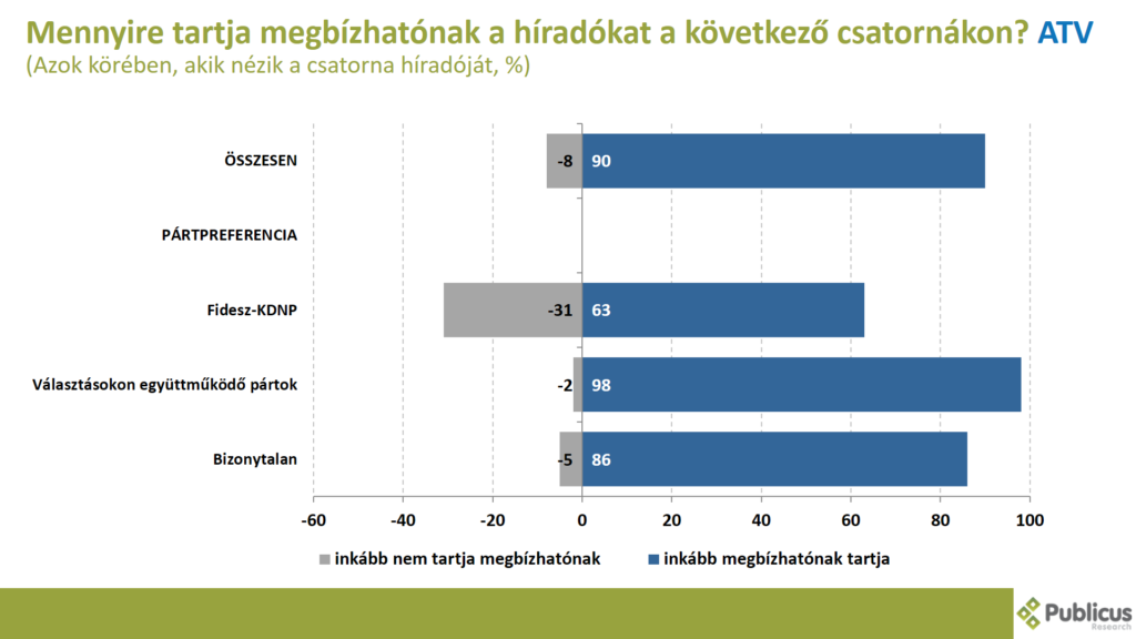 A választásokon együttműködő ellenzéki pártok szavazói közül szinte az összes (98 százalék), tízből közel kilenc (86 százalék) bizonytalan szavazó, illetve a Fidesz szavazók közel kétharmada (63 százalék) inkább megbízhatónak tartja az ATV híradóját.