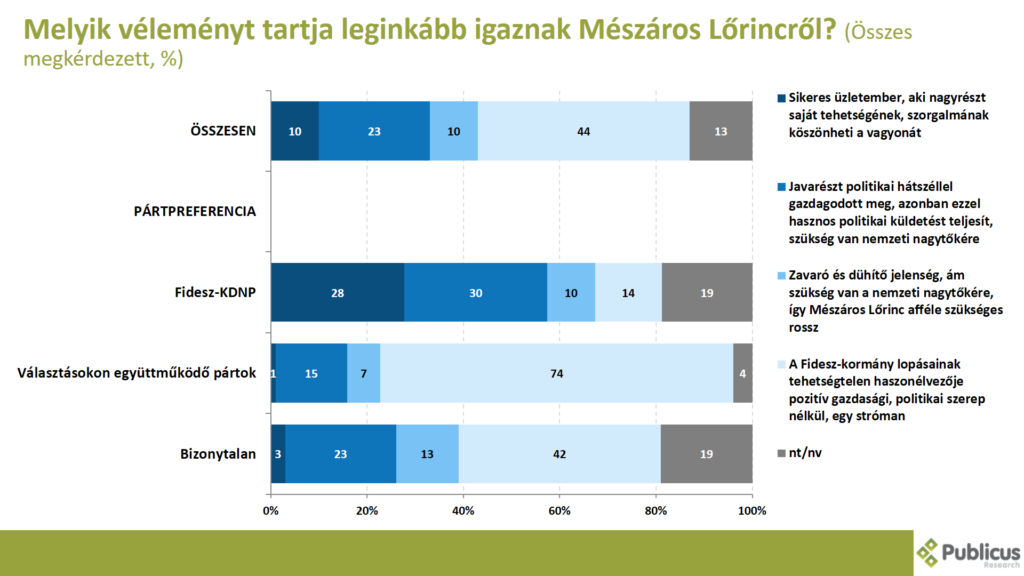 A válaszadók 44 százaléka azt a véleményt tartja leginkább igaznak Mészáros Lőrincről, hogy a Fidesz-kormány lopásainak tehetségtelen haszonélvezője pozitív gazdasági, politikai szerep nélkül, egy stróman. Így gondolja a választásokon együttműködő ellenzéki pártok szavazóinak a háromnegyede (74 százalék), tízből négy (42 százalék) bizonytalan szavazó, illetve a Fidesz szavazók 14 százaléka.