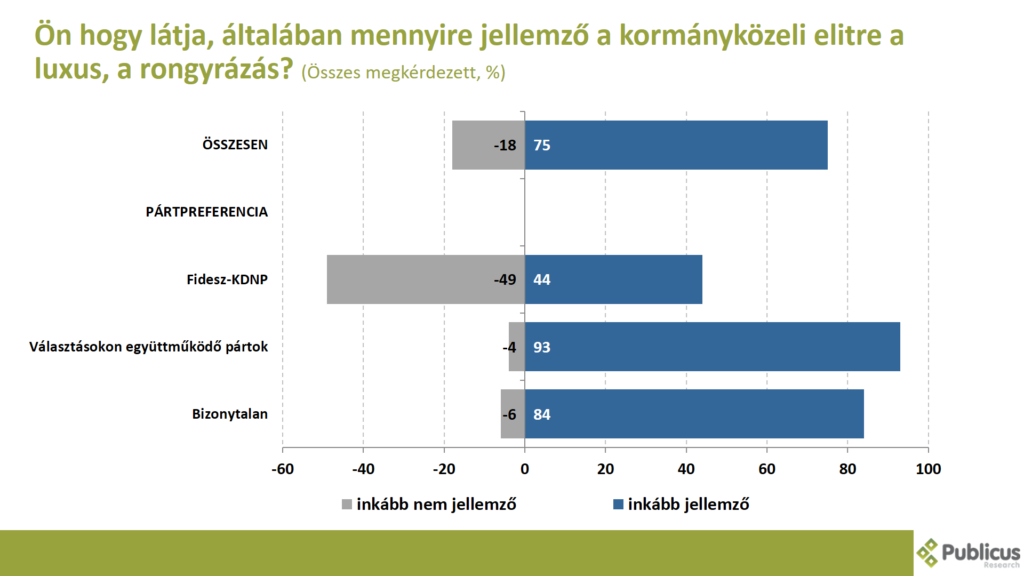 A válaszadók háromnegyede (75 százalék) úgy látja, általában inkább jellemző a kormányközeli elitre a luxus, a rongyrázás. Így nyilatkozotta választásokon együttműködő ellenzéki pártok szavazói közül szinte az összes (93 százalék), a bizonytalan szavazók túlnyomó többsége (84 százalék), illetve a Fidesz szavazók 44 százaléka.