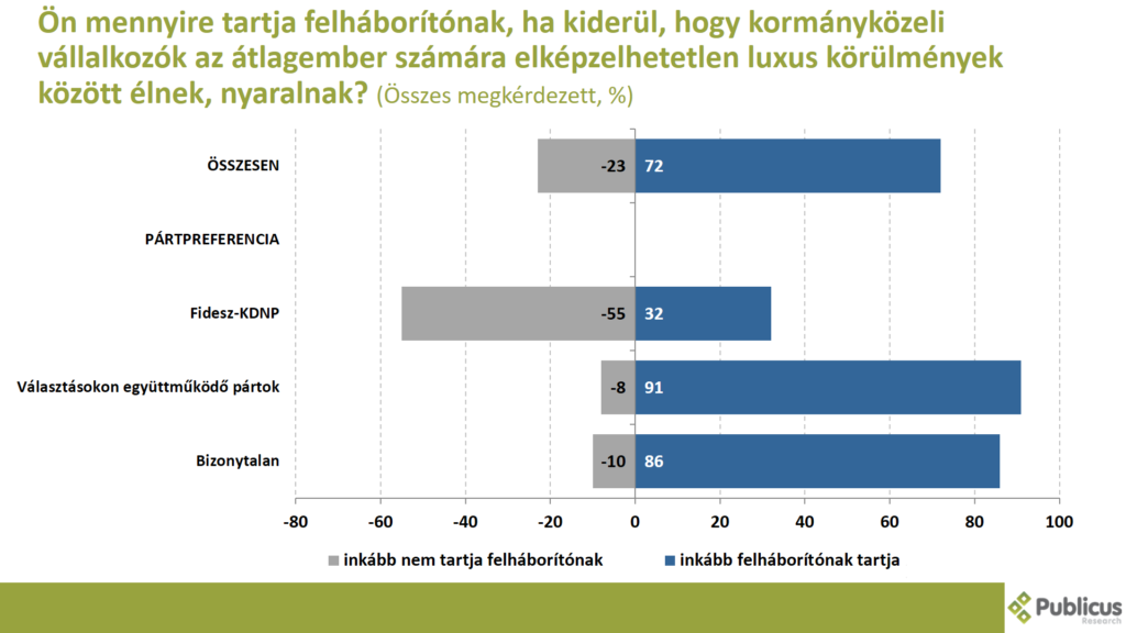 A megkérdezettek közel háromnegyede (72 százalék) inkább felháborítónak tartja, ha kiderül, hogy kormányközeli vállalkozók az átlagember számára elképzelhetetlen luxus körülmények között élnek, nyaralnak. Ezt mondta a választásokon együttműködő ellenzéki pártok szavazói közül tízből kilenc (91 százalék), a bizonytalan szavazók túlnyomó többsége (86 százalék), illetve a Fidesz szavazók harmada (32 százalék).