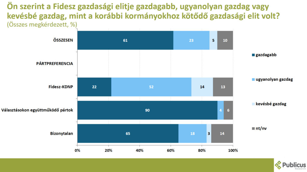 Tízből hat (61 százalék) válaszadó szerint a Fidesz gazdasági elitje gazdagabb mint a korábbi kormányokhoz kötődő gazdasági elit volt. Így gondolja a választásokon együttműködő ellenzéki pártok szavazói közül tízből kilenc (90 százalék), a bizonytalan szavazók kétharmada (65 százalék), illetve a Fidesz szavazók közel negyede (22 százalék).