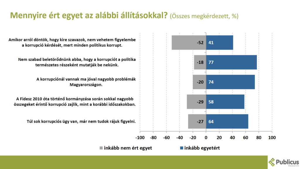 A válaszadók közel kétharmada (64 százalék) inkább egyetért azzal az állítással, hogy túl sok korrupciós ügy van, így már nem is tud rájuk figyelni. Tízből közel hatan (58 százalék) inkább egyetértenek azzal, hogy a Fidesz 2010 óta történő kormányzása során sokkal nagyobb összegeket érintő korrupció zajlik, mint a korábbi időszakokban.