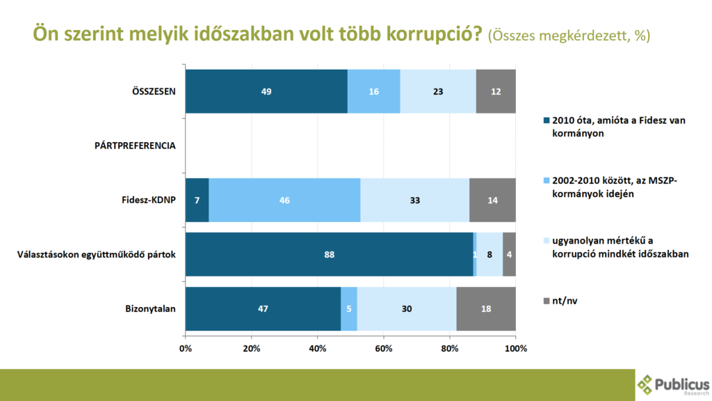 A megkérdezettek közel negyede (23 százalék) szerint ugyanolyan mértékű a korrupció mindkét időszakban. Ezt mondta a Fidesz szavazók harmada (33 százalék), tízből három (30 százalék) bizonytalan szavazó, illetve a választásokon együttműködő ellenzéki pártok szavazóinak a 8 százaléka.