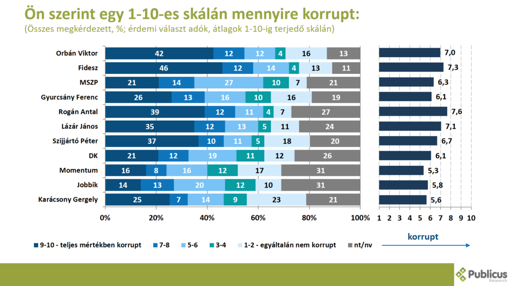 Egy 1-10-ig terjedő skálán átlagosan 7,0 pontot adtak arra, hogy Orbán Viktor mennyire korrupt. Nála átlagban csak a Fidesz mint párt (7,3), Lázár János (7,1) és Rogán Antal (7,6) korruptabb.