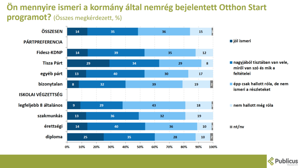 A megkérdezettek másik fele (51 százalék) vagy épp csak hallott róla valamit, vagy egyáltalán nem is értesült még az Otthon Start programról. Ezt mondta a bizonytalan szavazók 58 százaléka, a Fidesz szavazók 47 százaléka, illetve a Tisza Párt szavazóinak a 37 százaléka.