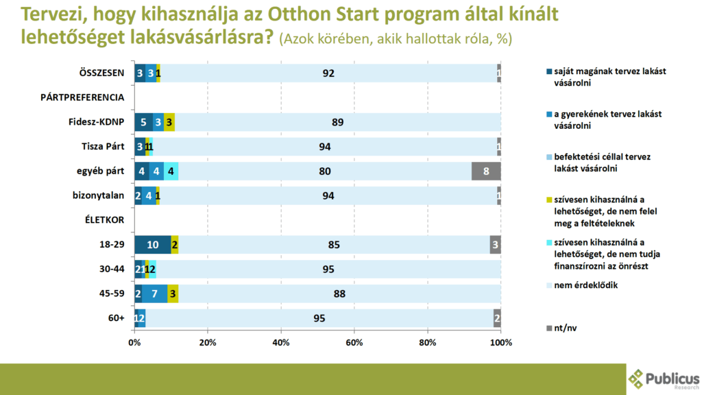 Azok körében, akik hallottak az Otthon Start programról, a válaszadók 3 százaléka saját magának tervez lakást vásárolni. Így nyilatkozott a Fidesz szavazók 5 százaléka, a Tisza Párt szavazóinak a 3 százaléka, illetve a bizonytalan szavazók 2 százaléka. Életkor alapján ezt mondta a 18-29 évesek 10 százaléka, a 30 és 59 év közöttiek 2 százaléka, illetve a 60 évnél idősebbek 1 százaléka.