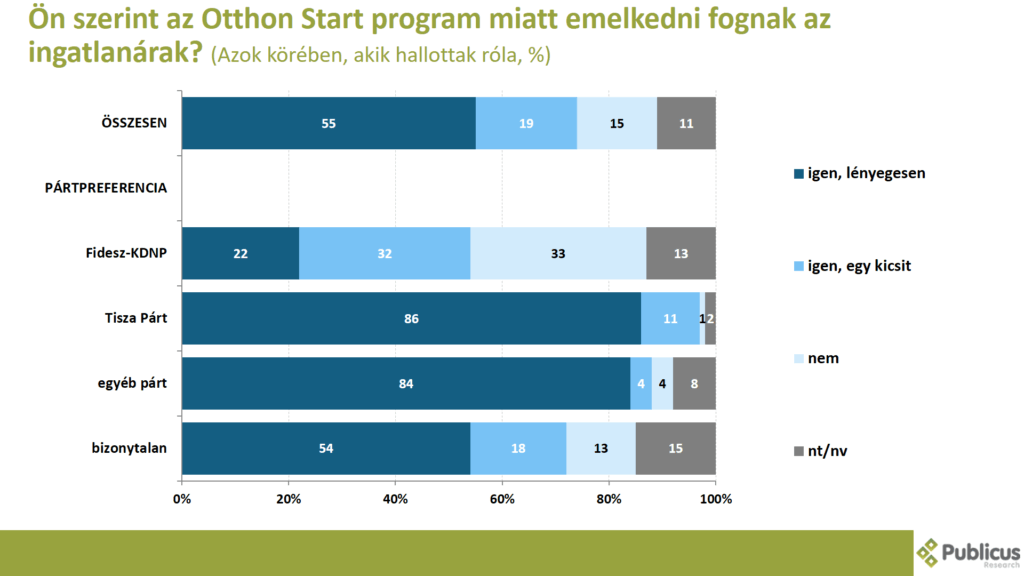 Szintén azok körében, akik hallottak az Otthon Start programról, a többség (55 százalék) úgy nyilatkozott, hogy szerintük lényegesen emelkedni fognak az ingatlanárak a hitelprogram miatt. Így gondolja a Tisza Párt szavazóinak a 86 százaléka, a bizonytalan szavazók 54 százaléka, illetve a Fidesz szavazók 22 százaléka.