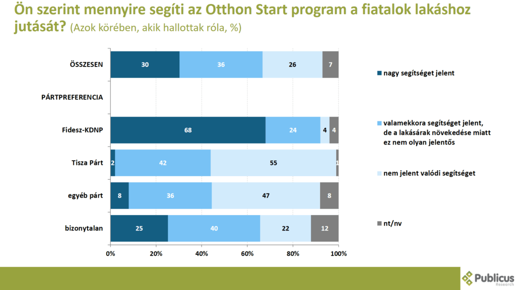 A válaszadók negyede (26 százalék) szerint az Otthon Start program nem jelent valódi segítséget a fiataloknak a lakáshoz jutáshoz. Így látja a Tisza Párt szavazóinak az 55 százaléka, a bizonytalan szavazók 22 százaléka, illetve a Fidesz szavazók 4 százaléka.