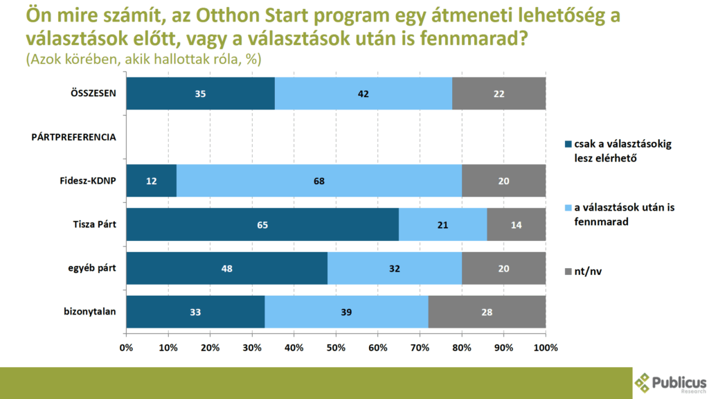 A válaszadók harmada (35 százalék) szerint az Otthon Start program csak egy átmeneti lehetőség, amely a választásokig lesz elérhető. Így látja a Tisza Párt szavazóinak a 65 százaléka, a bizonytalan szavazók 33 százaléka, illetve a Fidesz szavazók 12 százaléka