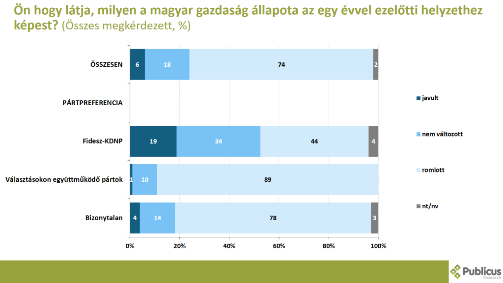 A válaszadók háromnegyede (74 százalék) úgy látja, hogy a magyar gazdaság állapota az egy évvel ezelőtti helyzethez képest romlott. Így nyilatkozott a választásokon együttműködő ellenzéki pártok szavazói közül tízből kilenc (89 százalék), tízből hét (72 százalék) bizonytalan szavazó, illetve a Fidesz szavazók közel fele (44 százalék).