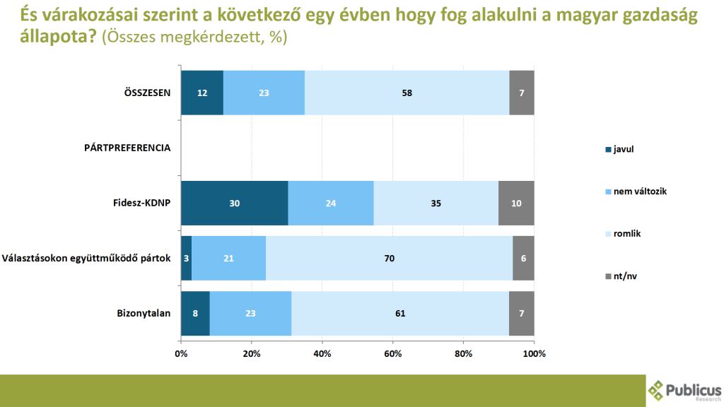 Tízből hat (58 százalék) megkérdezett szerint a következő egy évben a magyar gazdaság állapota romlani fog. Így látja a választásokon együttműködő ellenzéki pártok szavazói közül tízből hét (70 százalék) tízből hat (61 százalék) bizonytalan szavazó, illetve minden harmadik (35 százalék) Fidesz szavazó.