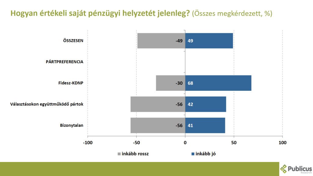 A válaszadók egyik fele inkább rossznak, a másik fele pedig inkább jónak értékeli a saját pénzügyi helyzetét jelenleg. Míg a Fidesz szavazók több mint kétharmada (68 százalék) inkább jónak ítéli meg a saját anyagi helyzetét, addig a bizonytalan szavazók, illetve a választásokon együttműködő ellenzéki pártok szavazóinak a többsége (56-56 százalék) inkább rossznak.